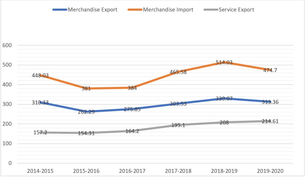 In 2015, the Ministry of Commerce and Industry had brought about a new International trade Policy which was to be in effect from 2015-2020 (Government of India, 2015). The new policy had two export schemes which were the Merchandise Exports from India Scheme (MEIS) and the Service Exports from India Scheme (SEIS). Thus, aiming towards a more export-oriented international trade.It also aimed to increase India’s exports of merchandise and services from $ 465.9 billion in 2013-14 to approximately $900 billion by 2019-2020 and to raise the Indian share in world exports from 2 percent to 3.5 percent (Sharma, 2019, pp. 116). Further, this policy also acted as a compliment to domestic policies such as Make in India and Skills India which look to create businesses, encourage entrepreneurship and employment, in light of the high youth percentage in the country. Table 1 below, shows the net exports from 2014 – 2019 and Table 2 below, shows the net imports for 2014-2019. On a closer analysis, we find that exports and imports have shown an increase from 2014 to 2019 along with trade deficit as imports have also shown significant growth during this period. Although oil has always been a major import for the country, another possible reason behind this deficit has been the rise in import of consumer products like electronic goods and stones, and intermediate goods such as machinery, inorganic and organic materials in a country with a rising middle class and budding entrepreneurial minds (Government of India, 2019) However, the export composition has seen a gradual shift from agricultural to non agricultural commodities (Trade Promotion Council of India, 2018). It has seen a rise in export of engineering, luxury and pharmaceutical products (Government of India, 2019). The graph also reveals that India has maintained trade surplus in terms of services. Covering a wide variety of activities such as from hotels and restaurants to business services, India has shown an increasing trend in service exports which are majorly destined to USA, UK and Japan.